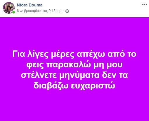 «Για λίγες ημέρες απέχω από το φεις παρακαλώ μη μου στέλνετε μηνύματα δεν τα διαβάζω ευχαριστώ», έγραψε.