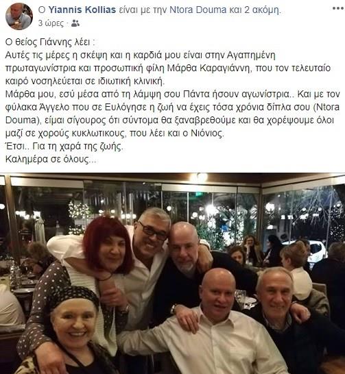 «Ο θείος Γιάννης λέει: Αυτές τις μέρες η σκέψη και η καρδιά μου είναι στην Αγαπημένη πρωταγωνίστρια και προσωπική φίλη Μάρθα Καραγιάννη, που τον τελευταίο καιρό νοσηλεύεται σε ιδιωτική κλινική. Μάρθα μου, εσύ μέσα από τη λάμψη σου Πάντα ήσουν αγωνίστρια.. Και με τον φύλακα Άγγελο που σε Ευλόγησε η ζωή να έχεις τόσα χρόνια δίπλα σου (Ntora Douma), είμαι σίγουρος ότι σύντομα θα ξαναβρεθούμε και θα χορέψουμε όλοι μαζί σε χορούς κυκλωτικους, που λέει και ο Νιόνιος. Έτσι.. Για τη χαρά της ζωής. Καλημέρα σε όλους...», έγραψε χαρακτηριστικά.