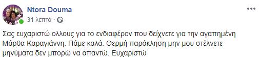 «Σας ευχαριστώ όλους για το ενδιαφέρον που δείχνετε για την αγαπημένη Μάρθα Καραγιάννη. Πάμε καλά. Θερμή παράκληση μην μου στέλνετε μηνύματα δεν μπορώ να απαντώ. Ευχαριστώ», έγραψε η Ντόρα Ντούμα με τα σχόλια από τους διαδικτυακούς της φίλους να είναι πολλά.
