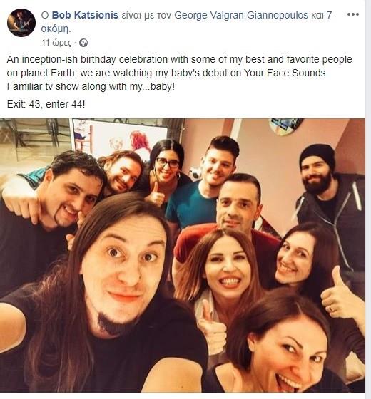 Ο γνωστός μουσικός, δημοσίευσε μάλιστα μια φωτογραφία στον προσωπικό του λογαριασμό στο facebook στην οποία πόζαρε με τους φίλους του και την αγαπημένη του, Ευρυδίκη και έγραψε: «Γιορτάζω τα γενέθλιά μου με μερικούς από τους καλύτερους και αγαπημένους μου ανθρώπους πάνω στη γη, παρακολουθώντας την πρεμιέρα του μωρού μου στο τηλεοπτικό show, Your Face Sounds Familiar».