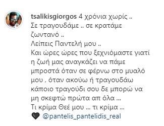 Συγκεκριμένα ο Γιώργος Τσαλίκης δημοσίευσε μια κοινή τους φωτογραφία από το παρελθόν και έγραψε: «4 χρόνια χωρίς .. Σε τραγουδάμε .. σε κρατάμε ζωντανό .. Λείπεις Παντελή μου .. Και ώρες ώρες που ξεχνιόμαστε γιατί η ζωή μας αναγκάζει να πάμε μπροστά όταν σε φέρνω στο μυαλό μου , όταν ακούω ή τραγουδάω κάποιο τραγούδι σου δε μπορώ να μη σκεφτώ πρώτα απ όλα ... Τι κρίμα Θεέ μου ... τι κρίμα ...»