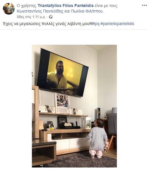 Με αφορμή τη σημερινή τραγική επέτειο του θανάτου του, ο αδερφός του Τριαντάφυλλος Παντελίδης προχώρησε σε μια ιδιαίτερα συγκινητική ανάρτηση. Συγκεκριμένα ο Τριαντάφυλλος Παντελίδης δημοσίευσε μια φωτογραφία με την ενός έτους κόρη του να παρακολουθεί σε video των γνωστό τραγουδιστή να ερμηνεύει μια από τις επιτυχίες του.