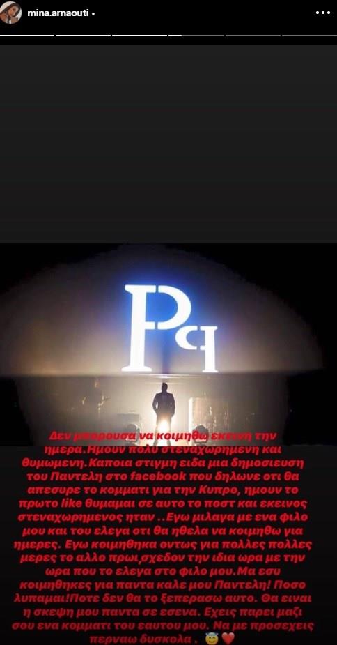 «Δεν μπορούσα να κοιμηθώ εκείνη την ημέρα. Ήμουν πολύ στεναχωρημένη και θυμωμένη. Κάποια στιγμή είδα μια δημοσίευση του Παντελή στο Facebook που δήλωνε ότι θα απέσυρε το κομμάτι για την Κύπρο, ήμουν το πρώτο like και σε αυτό το ποστ και εκείνος στεναχωρημένος ήταν. Εγώ μίλαγα με ένα φίλο μου και του έλεγα ότι θα ήθελα να κοιμηθώ για πολλές πολλές μέρες το άλλο πρωί, σχεδόν την ίδια ώρα με την ώρα που το έλεγα στο φίλο μου. Μα εσύ κοιμήθηκες για πάντα καλέ μου Παντελή. Πόσο λυπάμαι. Ποτέ δεν θα το ξεπεράσω αυτό. Θα είναι η σκέψη μου πάντα σε εσένα. Έχεις πάρει μαζί σου ένα κομμάτι του εαυτού μου. Να με προσέχεις περνάω δύσκολα. Έχω φυλάξει στην καρδιά μου την καρδιά σου. Τέσσερα χρόνια περάσανε ψυχή μου», έγραψε η Μίνα Αρναούτη.