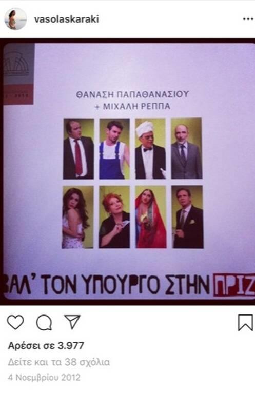 Το πρώτο post της Βάσως Λασκαράκη ήταν η αφίσα της θεατρικής παράστασης που πρωταγωνιστούσε στις 4 Νοεμβρίου του 2012