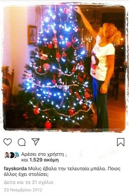 Η Φαίη Σκορδά επέλεξε ν' ανοίξει λογαριασμό στο instagram στις 23 Νοεμβρίου του 2012 και μας έδειξε ότι στόλισε το χριστουγεννιάτικο δέντρο της