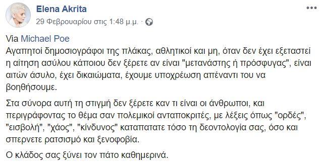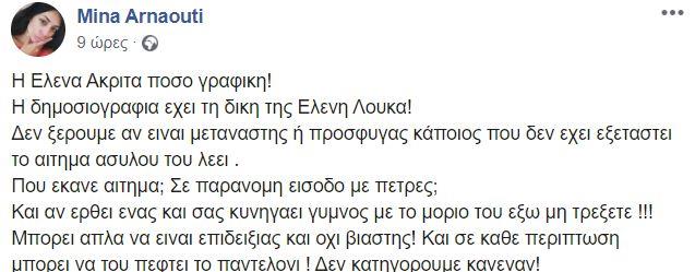 «Η Έλενα Ακρίτα πόσο γραφική! Η δημοσιογραφία έχει τη δική της Ελένη Λουκά! Δεν ξέρουμε αν είναι μετανάστης ή πρόσφυγας κάποιος που δεν έχει εξεταστεί το αίτημα ασύλου του λέει .Που έκανε αίτημα; Σε παράνομη είσοδο με πέτρες; Και αν έρθει ένας και σας κυνηγάει γυμνός με το μόριο του έξω μη τρέξετε !!!Μπορεί απλά να είναι επιδειξίας και όχι βιαστής! Και σε κάθε περίπτωση μπορεί να του πέφτει το παντελόνι! Δεν κατηγορούμε κανέναν!» έγραψε χαρακτηριστικά η Μίνα Αρναούτη.