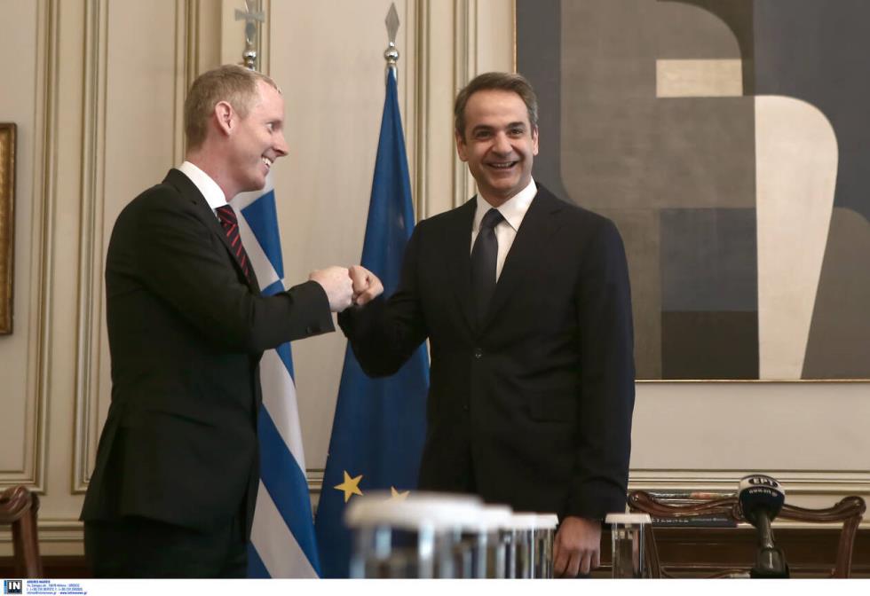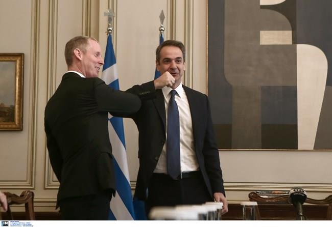 Λίγο για να στείλουν μήνυμα για την ανάγκη προληπτικών μέτρων για τον κορωνοϊό, λίγο για να στείλουν μήνυμα ψυχραιμίας, Κυριάκος Μητσοτάκης και ο αντιπρόεδρος της Ευρωπαικής Τράπεζας Επενδύσεων αποφάσισαν να αποφύγουν τις χειραψίες.