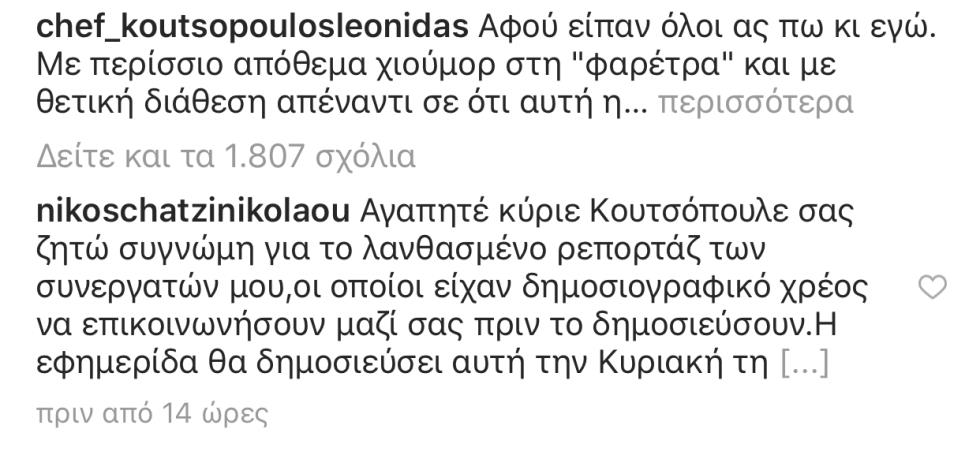 Λίγες ώρες μετά, κάτω από τη συγκεκριμένη ανάρτηση του Λεωνίδα Κουτσόπουλου, απάντησε και ο Νίκος Χατζηνικολάου με comment, ζητώντας συγγνώμη από τον γνωστό σεφ και τονίζοντας πως η εφημερίδα θα δημοσιεύσει την ερχόμενη Κυριακή τη διάψευση του.