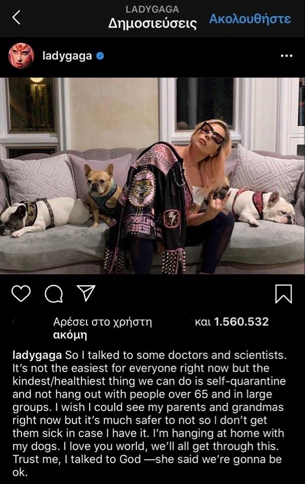 "Λοιπόν, μίλησα με μερικούς γιατρούς και επιστήμονες. Δεν είναι το πιο εύκολο για όλους τώρα, αλλά το καλύτερο και το πιο υγιεινό πράγμα που μπορούμε να κάνουμε είναι η αυτο-καραντίνα και να μην ξεχνάμε να μην συναναστρεφόμαστε με άτομα άνω των 65 ετών αλλά και να μην βρισκόμαστε σε μεγάλες παρέες. Μακάρι να μπορούσα να δω τους γονείς μου και τις γιαγιάδες μου τώρα, αλλά είναι πολύ πιο ασφαλές να μην τους μεταδώσω την ασθένεια σε περίπτωση που την έχω. Είμαι στο σπίτι με τα σκυλιά μου. Κόσμε σε αγαπώ και όλοι θα περάσουμε από αυτό. Πιστέψτε με, μίλησα με το Θεό - είπε ότι θα είμαστε εντάξει." έγραψε στη λεζάντα που συνόδευσε τη φωτογραφία της η Lady Gaga.