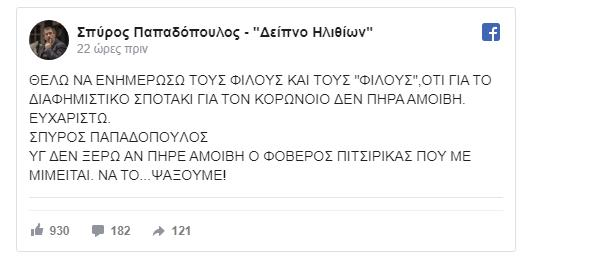 Ο ίδιος ο Σπύρος Παπαδόπουλος, με μια ανάρτησή του στο facebook, βάζει τα πράγματα στη θέση τους, αποκαλύπτοντας που δεν πήρε χρήματα για το σποτ του Μένουμε Σπίτι.