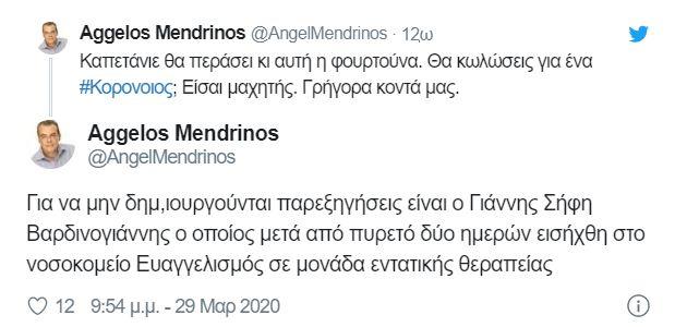 Ο δημοσιογράφος Άγγελος Μενδρινός έγραψε χαρακτηριστικά: «Καπετάνιε θα περάσει κι αυτή η φουρτούνα. Θα κωλώσεις για ένα κορονοϊό; Είσαι μαχητής. Γρήγορα κοντά μας. Για να μην δημιουργούνται παρεξηγήσεις είναι ο Γιάννης Σήφη Βαρδινογιάννης ο οποίος μετά από πυρετό δύο ημερών εισήχθη στο νοσοκομείο Ευαγγελισμός σε μονάδα εντατικής θεραπείας».