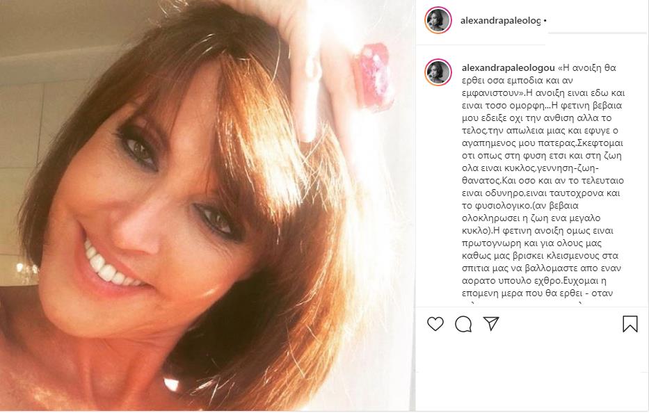 Με μια συγκινητική ανάρτηση που έκανε στον προσωπικό της λογαριασμό στο Instagram, η Αλεξάνδρα Παλαιολόγου αναφέρθηκε στην απώλεια του πατέρα της, αλλά και στις δύσκολες στιγμές που ζούμε λόγω του κορωνοϊού.
