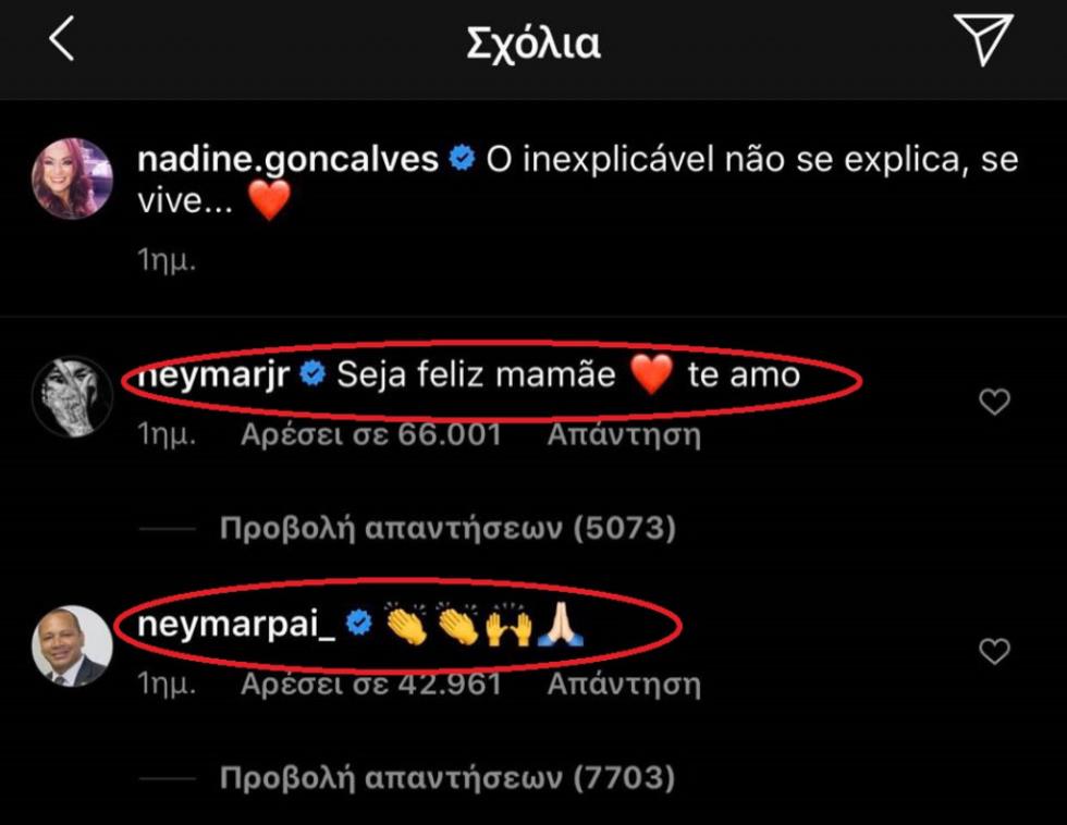 Η 52χρονη μητέρα του Νεϊμάρ ανέβασε στα μέσα κοινωνικής δικτύωσης φωτογραφία με τον αγαπημένο της και ο πρώτος που έσπευσε να της ευχηθεί για τη νέα σχέση της ήταν ο Βραζιλιάνος σούπερ σταρ, ο οποίος της έγραψε πόσο την αγαπάει και πόσο χαίρεται που είναι ευτυχισμένη.