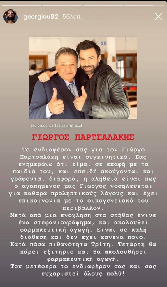 “Το ενδιαφέρον σας για τον Γιώργο Παρτσαλάκη είναι συγκινητικό. Σας ενημερώνω ότι είμαι σε επαφή με τα παιδιά του, και επειδή ακούγονται και γράφονται διάφορα, η αλήθεια είναι πως ο Γιώργος μας νοσηλεύεται για καθαρά προληπτικούς λόγους και έχει επικοινωνία με το οικογενειακό του περιβάλλον. Μετά από μια ενόχληση στο στήθος έγινε στεφανιογράφημα, και ακολουθεί φαρμακευτική αγωγή. Είναι σε καλή διάθεση και δεν έχει κανένα πόνο. Κατά πάσα πιθανότητα Τρίτη, Τετάρτη θα πάρει εξιτήριο και θα ακολουθήσει φαρμακευτική αγωγή. Του μετέφερα το ενδιαφέρον σας και σας ευχαριστεί όλους πολύ”, έγραψε συγκεκριμένα ο Ανδρέας Γεωργίου.