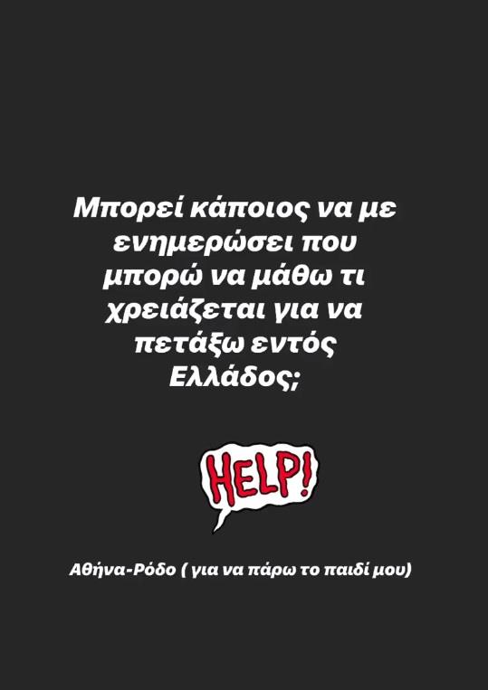 Το βράδυ της Τρίτης, λοιπόν, η ξανθιά καλλονή έκανε μια δημόσια έκκληση, μέσα από τα InstaStories της. Ο λόγος; Το τελευταίο διάστημα είναι μακριά από τον γιο της, ο οποίος βρίσκεται στη Ρόδο με τον μπαμπά του και η ίδια θέλει να ταξιδέψει στο νησί του Αιγαίου για να τον φέρει πίσω.