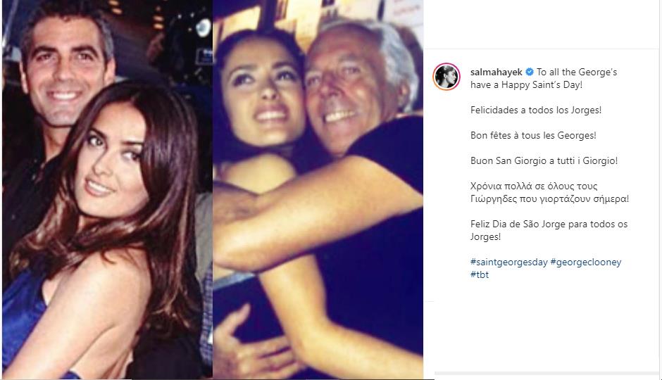 Στη λεζάντα που συνόδευε τη φωτογραφία η Σάλμα Χάγιεκ έγραψε ευχές για όσους γιορτάζουν σε πολλές γλώσσες, ανάμεσα σε αυτές και στα ελληνικά. «Χρόνια πολλά σε όλους τους Γιώργηδες που γιορτάζουν σήμερα» έγραψε συγκεκριμένα.