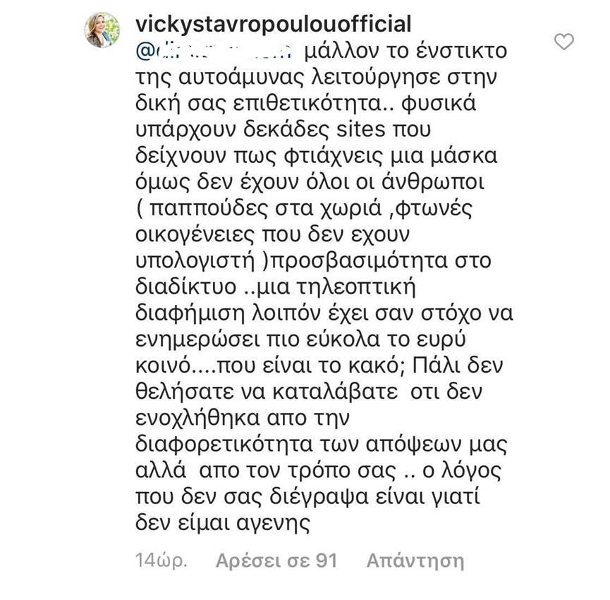 Η Βίκυ Σταυροπούλου δε δίστασε να απαντήσει ξανά: «Είναι φανερό από την στειρότητα των απόψεων σας οτι δεν πρόκειται να αλλάξετε σκοπιά ούτε να αναθεωρήσετε κάποιο σχόλιό σας αλλά αφου δεν προσδοκάτε κάτι και είστε από ότι μας δώσατε να καταλάβουμε μια πιο ενδιαφέρουσα προσωπικότητα γιατί είστε εδώ και σχολιάζετε; Περνάμε δύσκολα όλοι βρείτε τρόπο να να ηρεμήσετε την ψυχή σας!», ενώ στο τέλος έδωσε μια αφοπλιστική απάντηση κλείνοντας τη συζήτηση: «Μάλλον το ένστικτο της αυτοάμυνας λειτούργησε στην δική σας επιθετικότητα.. φυσικά υπάρχουν δεκάδες sites που δείχνουν πως φτιάχνεις μια μάσκα όμως δεν έχουν όλοι οι άνθρωποι (παππούδες στα χωριά, φτωνές οικογένειες που δεν έχουν υπολογιστή) προσβασιμότητα στο διαδίκτυο ..μια τηλεοπτική διαφήμιση λοιπόν έχει σαν στόχο να ενημερώσει πιο εύκολα το ευρύ κοινό....που είναι το κακό; Πάλι δεν θελήσατε να καταλάβατε ότι δεν ενοχλήθηκα από την διαφορετικότητα των
