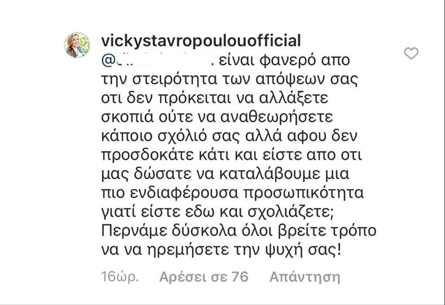 Μια έντονη συζήτηση είχε με έναν διαδυκτιακό της φίλο στον προσωπικό της λογαριασμό στο Instagram, η Βίκυ Σταυροπούλου.