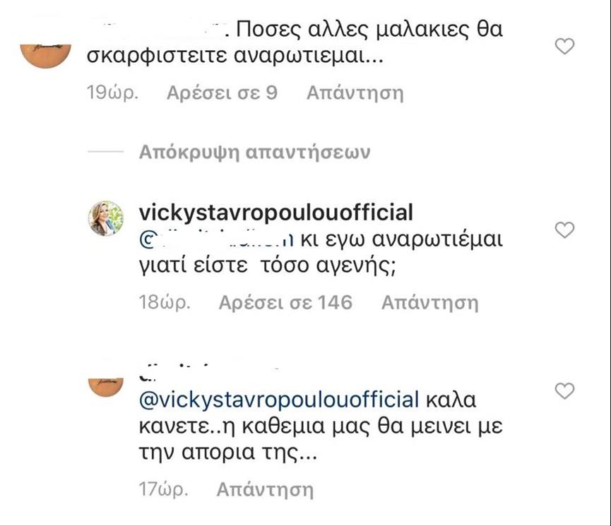 Από την πλευρά της η Βίκυ Σταυροπούλου απάντησε: «κι εγώ αναρωτιέμαι γιατί είστε τόσο αγενής;».