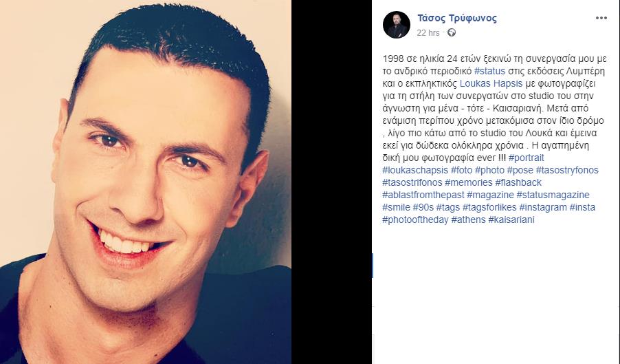 "1998 σε ηλικία 24 ετών ξεκινώ τη συνεργασία μου με το ανδρικό περιοδικό #status στις εκδόσεις Λυμπέρη και ο εκπληκτικός Loukas Hapsis με φωτογραφίζει για τη στήλη των συνεργατών στο studio του στην άγνωστη για μένα - τότε - Καισαριανή. Μετά από ενάμιση περίπου χρόνο μετακόμισα στον ίδιο δρόμο , λίγο πιο κάτω από το studio του Λουκά και έμεινα εκεί για δώδεκα ολόκληρα χρόνια . Η αγαπημένη δική μου φωτογραφία ever!", έγραψε στην λεζάντα της αναρτήσης του.