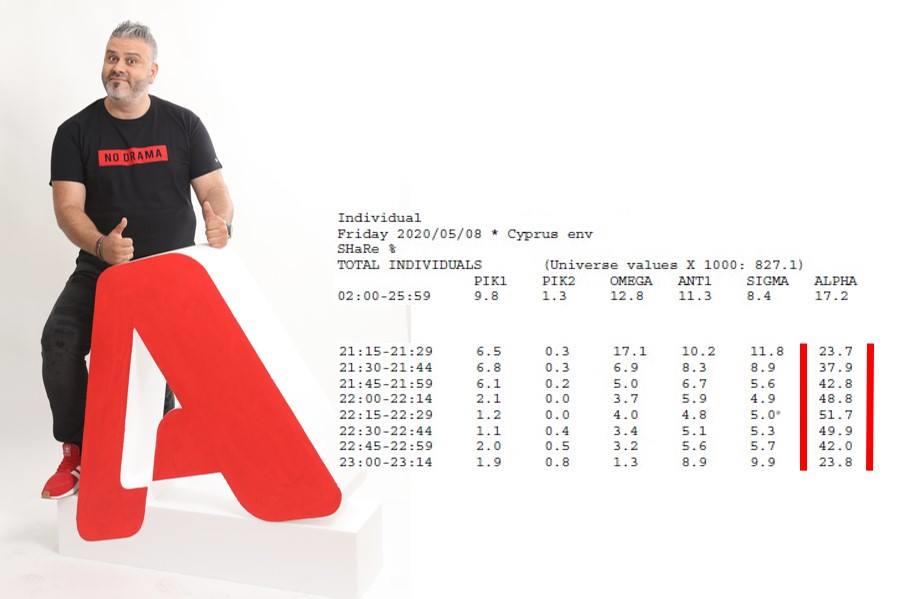 Την ίδια ώρα ο ALPHA Κύπρου τερμάτισε πρώτος σε γενική τηλεθέαση στο σύνολο της ημέρας με ποσοστό 17,2%