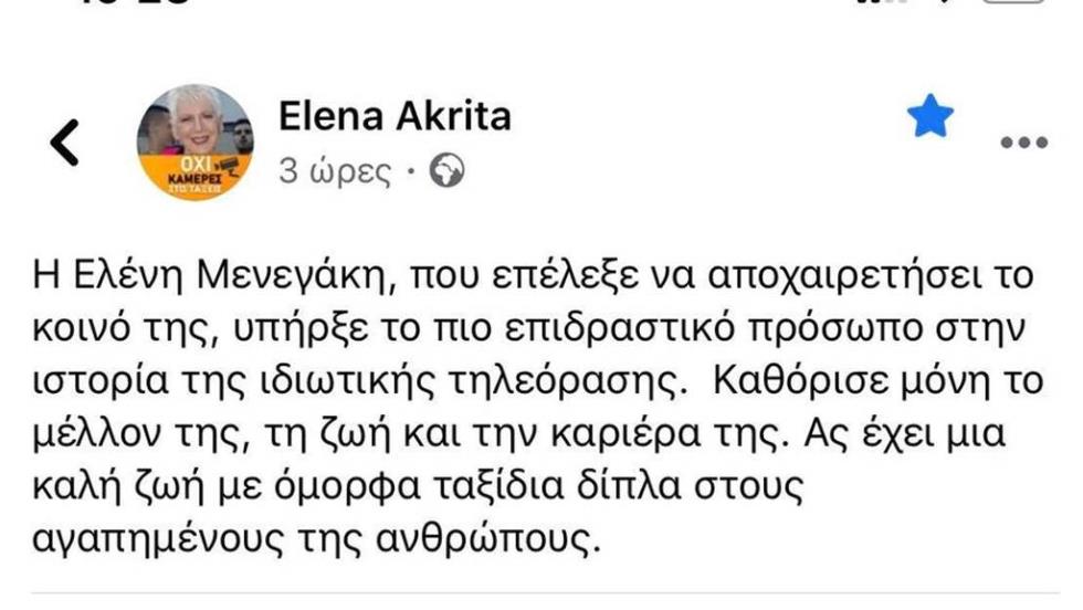 «Η Ελένη Μενεγάκη, που επέλεξε να αποχαιρετήσει το κοινό της, υπήρξε το πιο επιδραστικό πρόσωπο στην ιστορία της ιδιωτικής τηλεόρασης. Καθόρισε μόνη το μέλλον της, τη ζωή και την καριέρα της. Ας έχει μια καλή ζωή με όμορφα ταξίδια δίπλα στους αγαπημένους της ανθρώπους» έγραψε χαρακτηριστικά