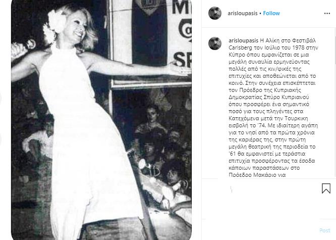 Μια φωτογραφία της αξέχαστης Αλίκης Βουγιουκλάκη από τα παλιά ανέβασε στο instagram ο δημοσιογράφος και συλλέκτης Άρης Λουπάσης.