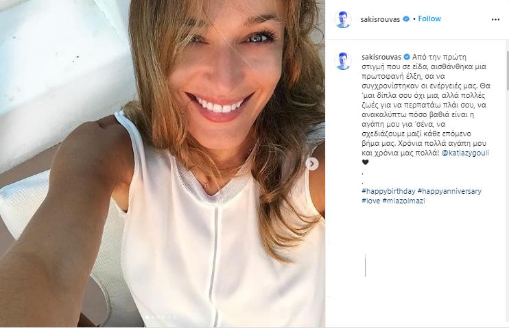 «Από την πρώτη στιγμή που σε είδα, αισθάνθηκα μια πρωτοφανή έλξη, σα να συγχρονίστηκαν οι ενέργειές μας. Θα ‘μαι δίπλα σου όχι μια, αλλά πολλές ζωές για να περπατάω πλάι σου, να ανακαλύπτω πόσο βαθιά είναι η αγάπη μου για σένα, να σχεδιάζουμε μαζί κάθε επόμενο βήμα μας. Χρόνια πολλά αγάπη μου και χρόνια μας πολλά!», έγραψε ο Σάκης Ρουβάς.