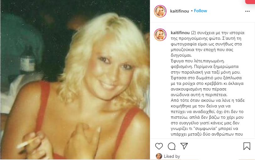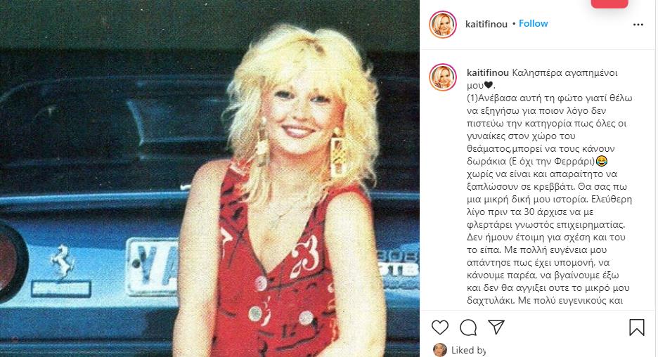 Με δύο μακροσκελείς αναρτήσεις της στο instagram η Καίτη Φίνου περιέγραψε με λεπτομέρειες την επί μήνες ερωτική διεκδίκησή της, πριν από 30 χρόνια, από έναν Έλληνα πλούσιο επιχειρηματία με τον οποίο τελικά δεν απέκτησε δεσμό.