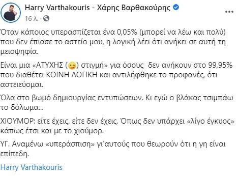 «Όταν κάποιος υπερασπίζεται ένα 0,05% (μπορεί να λέω και πολύ) που δεν έπιασε το αστείο μου, η λογική λέει ότι ανήκει σε αυτή τη μειοψηφία. Είναι μια «ΑΤΥΧΗΣ στιγμή» για όσους δεν ανήκουν στο 99,95% που διαθέτει ΚΟΙΝΗ ΛΟΓΙΚΗ και αντιλήφθηκε το προφανές, ότι αστειεύομαι. Όλα στο βωμό δημιουργίας εντυπώσεων. Κι εγώ ο βλάκας τσιμπάω το δόλωμα... ΧΙΟΥΜΟΡ: είτε έχεις, είτε δεν έχεις. Όπως δεν υπάρχει «λίγο έγκυος» κάπως έτσι και με το χιούμορ. ΥΓ. Αναμένω «υπεράσπιση» γι’αυτούς που θεωρούν ότι η γη είναι επίπεδη. Harry Varthakouris», έγραψε ο Χάρης Βαρθακούρης.
