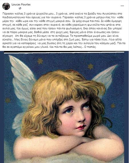 «Πέρασαν κιόλας 3 χρόνια ψυχούλα μου... 3 χρόνια.. από εκείνο το βράδυ του Αυγούστου στο παιδοογκολογικό που έφυγες για τον ουρανό»