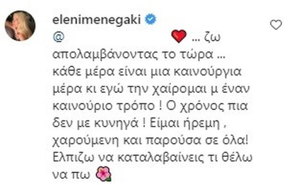 Η Ελένη Μενεγάκη έκανε μια εξομολόγηση για τη ζωή της, λίγο καιρό μετά το φινάλε της εκπομπής της στον Alpha: «Ζω απολαμβάνοντας το τώρα ... κάθε μέρα είναι μια καινούργια μέρα κι εγώ την χαίρομαι μ έναν καινούριο τρόπο ! Ο χρόνος πια δεν με κυνηγά ! Είμαι ήρεμη , χαρούμενη και παρούσα σε όλα! Ελπίζω να καταλαβαίνεις τι θέλω να πω».