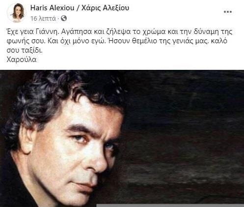 «Έχε γεια Γιάννη. Αγάπησα και ζήλεψα το χρώμα και την δύναμη της φωνής σου. Και όχι μόνο εγώ» σημειώνει χαρακτηριστικά η Χάρις Αλεξίου στο προφίλ που διατηρεί στο Faceook.
