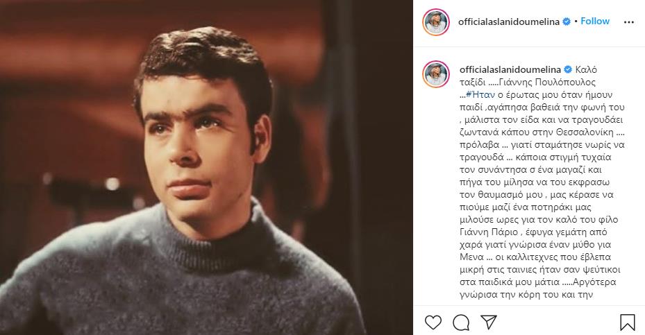 «Καλό ταξίδι …..Γιάννης Πουλόπουλος …#Ήταν ο έρωτας μου όταν ήμουν παιδί, αγάπησα βαθιά την φωνή του, μάλιστα τον είδα και να τραγουδάει ζωντανά κάπου στην Θεσσαλονίκη …. πρόλαβα … γιατί σταμάτησε νωρίς να τραγουδά … κάποια στιγμή τυχαία τον συνάντησα σε ένα μαγαζί και πήγα του μίλησα να του εκφράσω τον θαυμασμό μου, μας κέρασε να πιούμε μαζί ένα ποτηράκι μας μιλούσε ώρες για τον καλό του φίλο Γιάννη Πάρι , έφυγα γεμάτη από χαρά γιατί γνώρισα έναν μύθο για Μένα … οι καλλιτέχνες που έβλεπα μικρή στις ταινίες ήταν σαν ψεύτικοι στα παιδικά μου μάτια ….. Αργότερα γνώρισα την κόρη του και την γυναίκα του υπέροχα πλάσματα … καλό ταξίδι Γιάννη Πουλόπουλε … δύναμη στην οικογένεια σου εύχομαι …θα τα πούμε την Τετάρτη για το τελευταίο αντίο αφού δεν προλάβαμε να πούμε και άλλες κουβέντες …. Σ ευχαριστούμε που μοιράστηκες το δώρο της καλής σου φωνής … και μας έδειξες έναν δρόμο …. τον δικό σου το δρόμο στην μουσική …. Ευχαριστούμε …. Αντίο» έγραψε χαρακτηριστικά η Μελίνα Ασλανίδου.