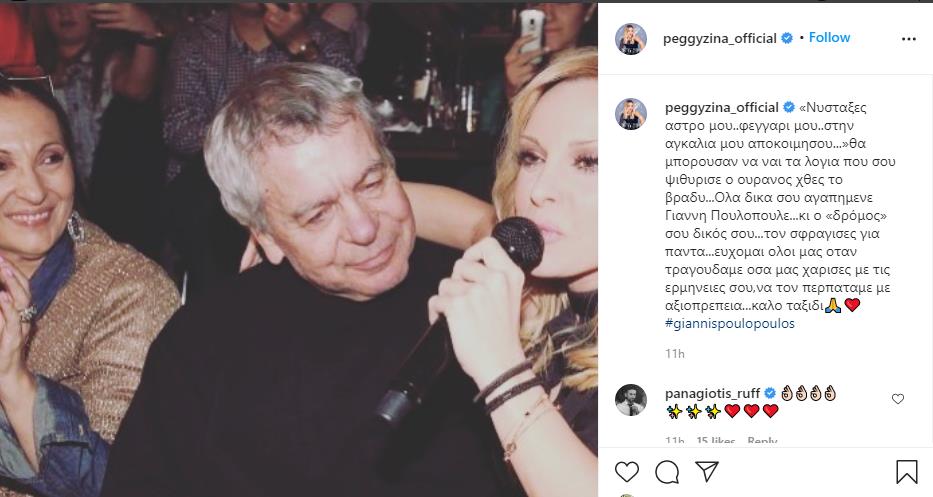 «Νύσταξες αστρο μου..φεγγάρι μου..στην αγκαλιά μου αποκοιμήσου...»θα μπορούσαν να ναι τα λογια που σου ψιθύρισε ο ουρανός χθες το βράδυ...Όλα δικά σου αγαπημένε Γιάννη Πουλοπουλε...κι ο «δρόμος» σου δικός σου...τον σφράγισες για πάντα...εύχομαι όλοι μας όταν τραγουδάμε όσα μας χάρισες με τις ερμηνείες σου,να τον περπατάμε με αξιοπρέπεια...καλό ταξίδι❤️#giannispoulopoulos», σημείωσε σε μια φωτογραφία που τους βλέπουμε μαζί.