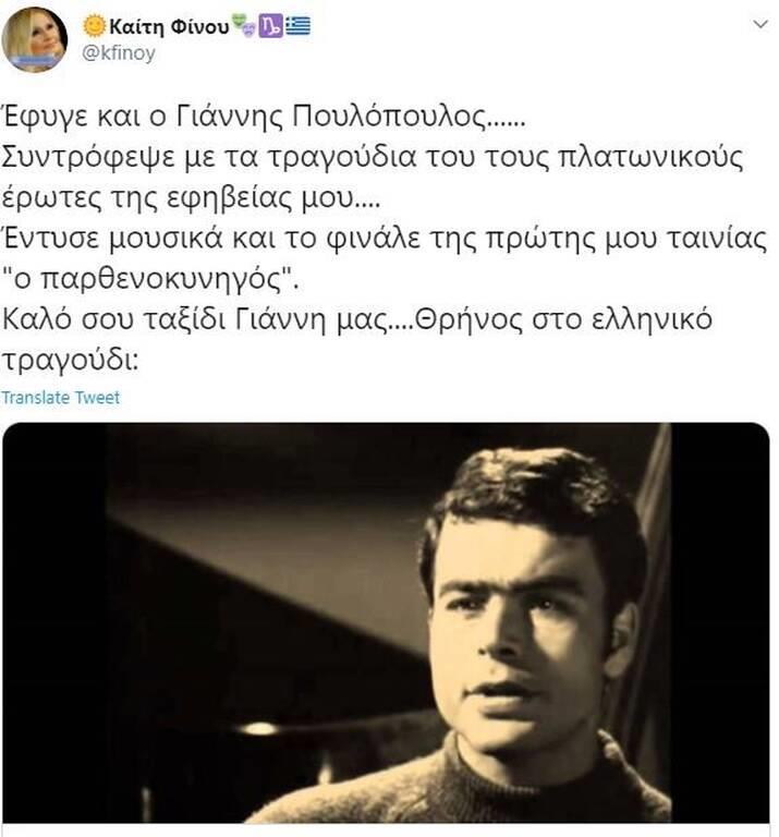 "Έφυγε και ο Γιάννης Πουλόπουλος......Συντρόφεψε με τα τραγούδια του τους πλατωνικούς έρωτες της εφηβείας μου....Έντυσε μουσικά και το φινάλε της πρώτης μου ταινίας "ο παρθενοκυνηγός".Καλό σου ταξίδι Γιάννη μας.....Συλλυπητήρια στην οικογένειά σου...." έγραψε η Καίτη Φίνου.