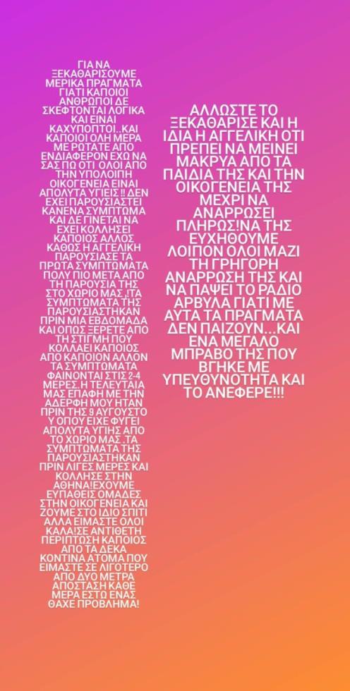 Χθες αργά το βράδυ η Αγγελική φορώντας μάσκα δημοσίευσε ένα βίντεο ευχαριστώντας όλο τον κόσμο για τα περαστικά που της έστειλε αλλά και για τα λόγια αγάπης!