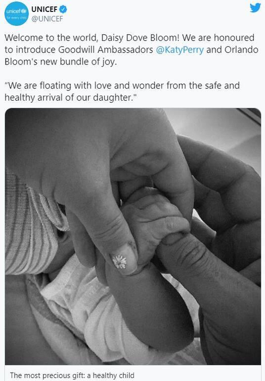 Το χαρμόσυνο γεγονός έγινε γνωστό μέσα από τον επίσημο λογαριασμό της Unicef, όπου είδαμε και την πρώτη φωτογραφία της νεογέννητης κόρης του ζευγαριού.