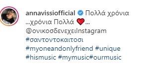 «Πολλά χρόνια ...χρόνια Πολλά @ονικοσδενεχειInstagram #σαντοντοκαιτοσι #myoneandonlyfriend #unique #hismusic #mymusic#ourmusic», έγραψε στη λεζάντα της ανάρτησής της η Αννα Βίσση.