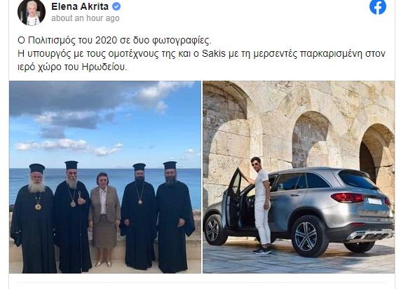 “Ο Πολιτισμός του 2020 σε δυο φωτογραφίες. Η υπουργός με τους ομοτέχνους της και ο Sakis με τη μερσεντές παρκαρισμένη στον ιερό χώρο του Ηρωδείου”.