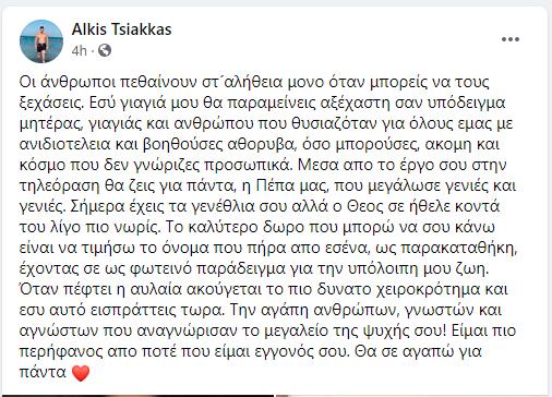 «Οι άνθρωποι πεθαίνουν στ´αλήθεια μόνο όταν μπορείς να τους ξεχάσεις. Εσύ γιαγιά μου θα παραμείνεις αξέχαστη σαν υπόδειγμα μητέρας, γιαγιάς και ανθρώπου που θυσιαζόταν για όλους εμάς με ανιδιοτέλεια και βοηθούσες αθόρυβα, όσο μπορούσες, ακόμη και κόσμο που δεν γνώριζες προσωπικά», έγραψε σε ανάρτησή του ο εγγονός της Άλκης.