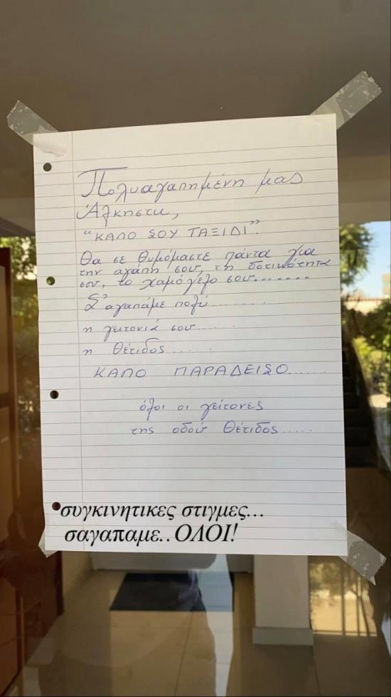 Ανάρτηση έκανε και η εγγονή της Μαρία, με μία φωτογραφία αποχαιρετιστήριου σημειώματος που άφησαν οι γείτονες της Άλκηστης Παυλίδου. «Καλό σου ταξίδι», έγραψαν. «Θα σε θυμόμαστε πάντα για την αγάπη σου, τη δοτικότητά σου, το χαμόγελό σου…».