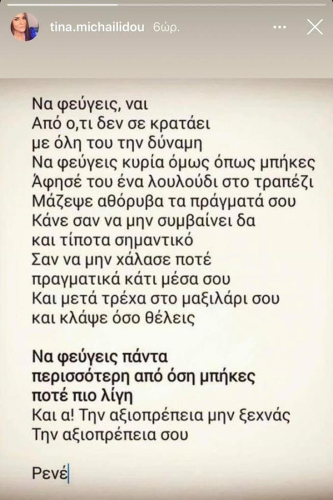 «Προφανώς για να παραιτούμαι 13 Οκτωβρίου υπάρχει σοβαρός λόγος. Δεν έχω να επιβεβαιώσω κάτι αυτή τη στιγμή (για τοξική σχέση). Δεν έχω φύγει από άλλες κι άλλες εκπομπές. Οφείλω να διασφαλίσω την ψυχική μου ακεραιότητα. Δεν θέλω να αναφερθώ σε κάτι τέτοιο (κακές σχέσεις με τον Νίκο Μάνεση). Είναι τιμή μου που συνεργάστηκα με την Ελεονώρα. Θα έκανα με χαρά ό,τι μου ζητούσε κάποιος όταν όμως υπάρχει αλληλοσεβασμός. Για να φεύγω σημαίνει ότι δεν αντέχω άλλο. Είμαι στρατιώτης. Δεν είναι επιλογή μου να μείνω άνεργη», είπε η Τίνα Μιχαηλίδου, εμφανώς συγκινημένη.
