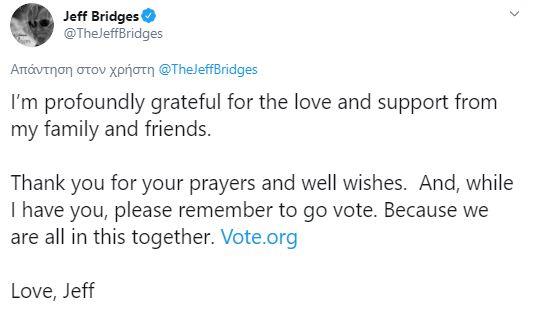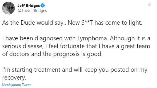 «Διαγνώστηκα με λέμφωμα. Παρότι είναι μία σοβαρή ασθένεια, αισθάνομαι τυχερός που έχω μία σπουδαία ομάδα γιατρών και η πρόγνωση είναι καλή. Ξεκινώ θεραπεία και θα σας ενημερώνω για την ανάρρωσή μου. Είμαι ιδιαίτερα ευγνώμων για την αγάπη και την υποστήριξη από την οικογένειά μου και τους φίλους μου. Σας ευχαριστώ για τις προσευχές σας και τις ευχές σας» έγραψε χαρακτηριστικά ο Jeff Bridges, χωρίς να δίνει περισσότερες λεπτομέρειες.