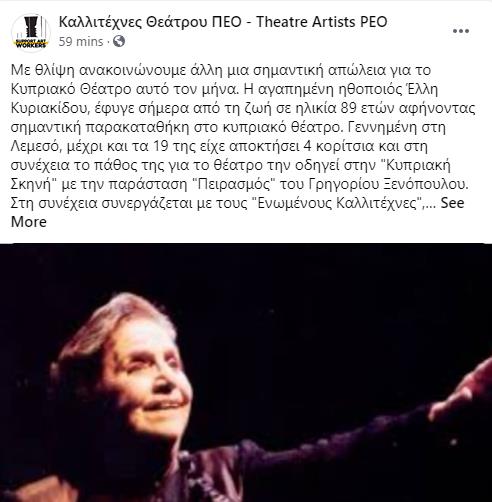 Το ΑΚΕΛ εκφράζει τη βαθύτατη του θλίψη για τον θάνατο της ηθοποιού Έλλης Κυριακίδου, η οποία έγραψε με φωτεινά γράμματα το όνομά της στην ιστορία του κυπριακού θεάτρου.