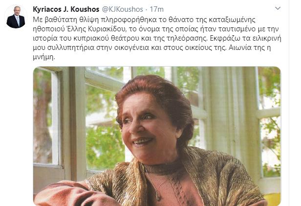 Τη θλίψη του για το θάνατο της ηθοποιού Έλλης Κυριακίδου, εκφράζει, σε ανάρτηση του στο προσωπικό του λογαριασμό στο Twitter, ο Κυβερνητικός Εκπρόσωπος Κυριάκος Κούσιος.