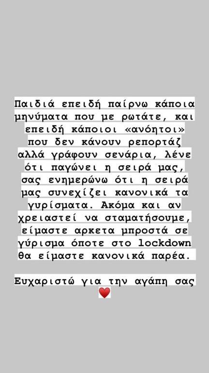 «Παιδιά επειδή παίρνω κάποια μηνύματα που με ρωτάτε και επειδή κάποιοι “ανόητοι” που δεν κάνουν ρεπορτάζ, γράφουν σενάρια, λένε ότι παγώνει η σειρά μας.