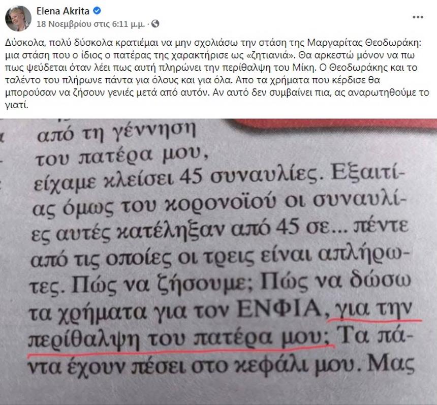 Η Έλενα Ακρίτα πριν λίγες ημέρες είχε γράψει στο facebook: «Δύσκολα, πολύ δύσκολα κρατιέμαι να μην σχολιάσω την στάση της Μαργαρίτας Θεοδωράκη: μια στάση που ο ίδιος ο πατέρας της χαρακτήρισε ως «ζητιανιά». Θα αρκεστώ μόνον να πω πως ψεύδεται όταν λέει πως αυτή πληρώνει την περίθαλψη του Μίκη.
