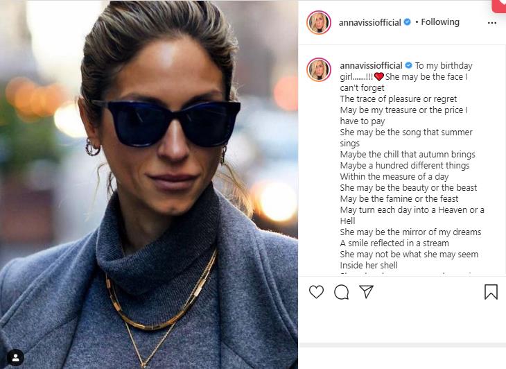 Συγκεκριμένα η Άννα Βίσση πόσταρε μια φώτο της κόρης της και έγραψε: «Για το κορίτσι μου που έχει γενέθλια. Είναι το πρόσωπο που δεν μπορώ να ξεχάσω. Το αίσθημα ευχαρίστησης ή λύπης. Είναι το αίσθημα της ικανοποίησης ή το τίμημα που πρέπει να πληρώσω. Μπορεί να είναι το καλοκαιρινό μου τραγούδι. Μπορεί να είναι μια φθινοπωρινή χαλάρωση. Ίσως είναι 100 διαφορετικά πράγματα. Ένα όμορφο πράγμα σε μια μίζερη ημέρα».
