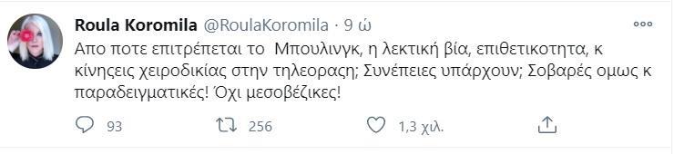 Η Ρούλα Κορομηλά που παρακολουθεί το ριάλιτι και συχνά σχολιάζει τα όσα γίνονται μέσα από το twitter φαίνεται να ενοχλήθηκε πολύ από όσα έβλέπε για αυτό και έγραψε, «Aπό πότε επιτρέπεται το Μπουλινγκ, η λεκτική βία, επιθετικότητα, κ κινήσεις χειροδικίας στην τηλεόραση; Συνέπειες υπάρχουν; Σοβαρές όμως κ παραδειγματικές! Όχι μεσοβέζικες!».